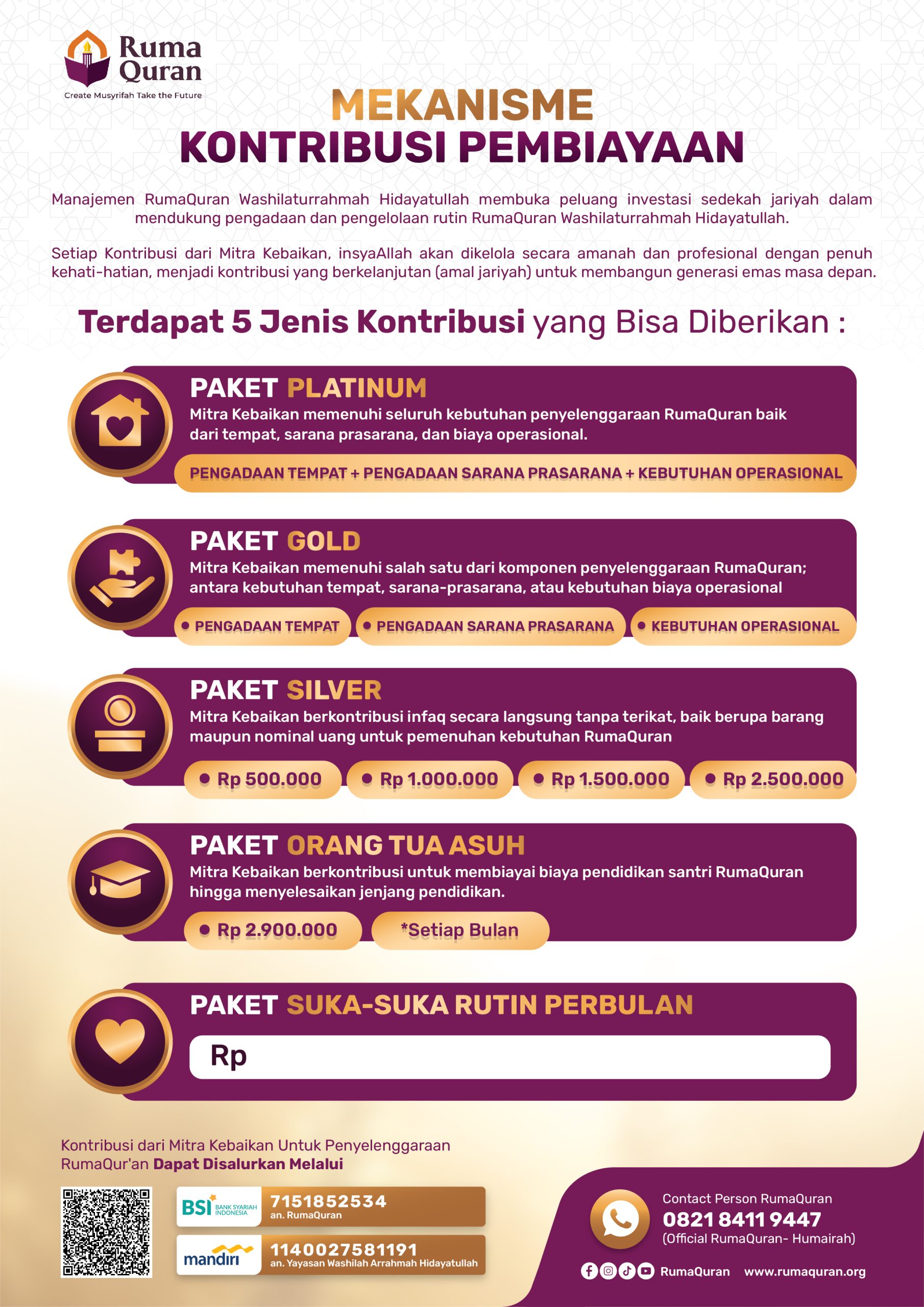 Mendukung pengadaan dan pengelolaan rutin RumaQur’an Washilaturrahmah hidayatullah dengan 5 jenis kontribusi.