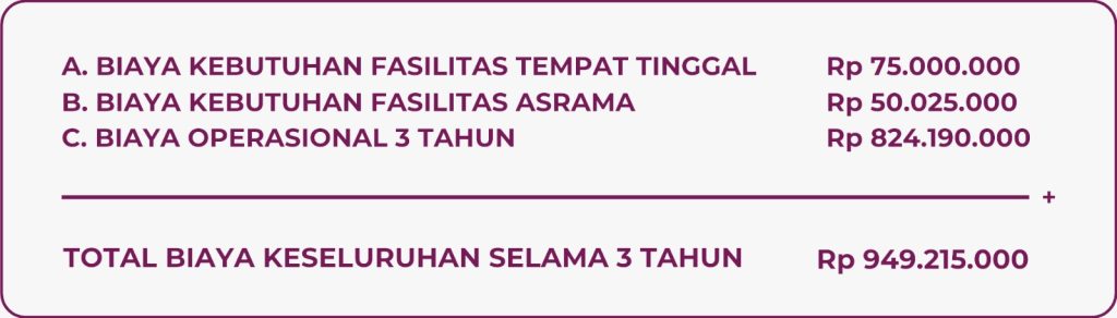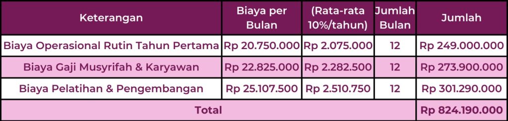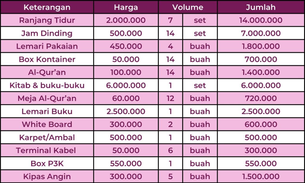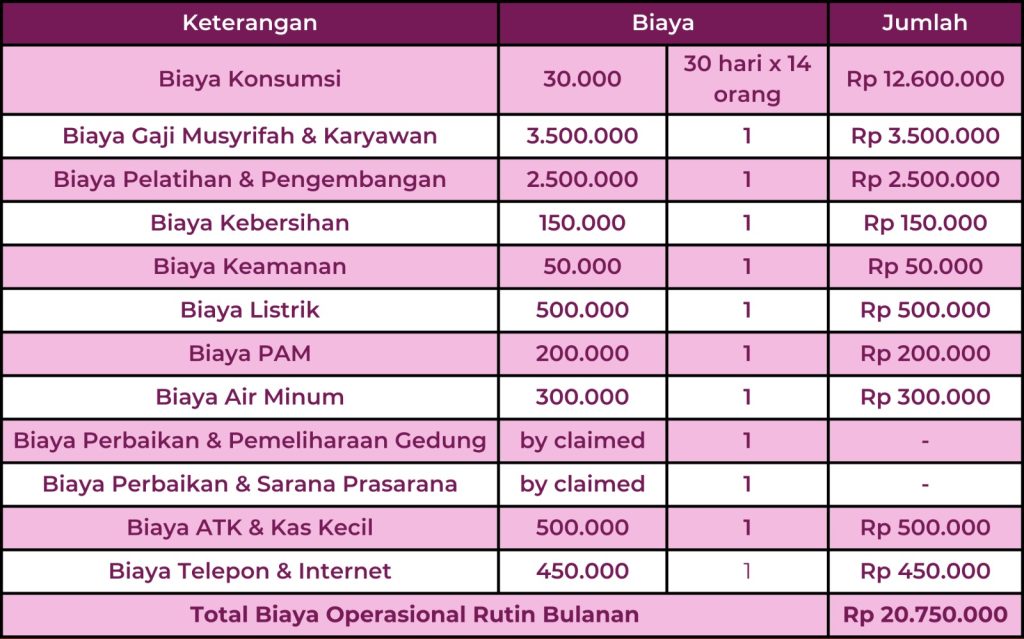 Kebutuhan operasional dihitung dengan perhitungan ideal sebuah RumaQur’an selama 1 bulan yang terdiri dari 12 santri, 1 musyrifah dan 1 asisten Musyrifah. Kebutuhan yang diperlukan tersebut diantaranya :