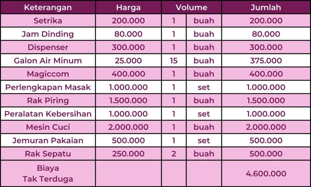Kebutuhan tempat tinggal meliputi biaya rumah, renovasi (jika diperlukan), maupun biaya lainnya berkaitan dengan tempat tinggal.