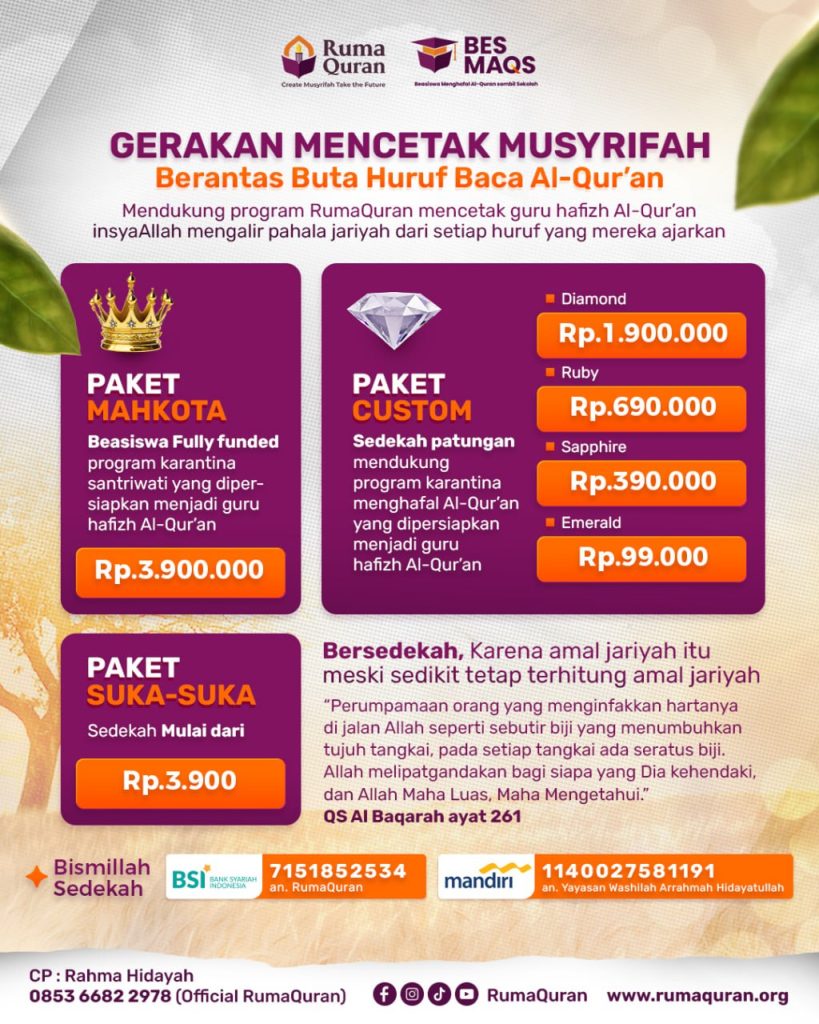 Mendukung program RumaQuran mencetak guru hafizh Al-Qur’an dalam memberantas buta huruf baca Al-Qur’an dengan berbagai jenis paket kontribusi